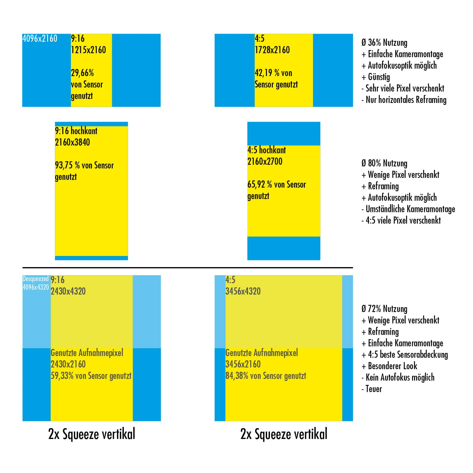 Filmkameras hochkant zu montieren ist die passende Lösung, wenn das einzige Format der Ausspielung 9:16 ist. Es gibt jedoch 2 Probleme: Oft wird ein Video bei Instagram auch für den Feed genutzt, wo es ein Seitenverhältnis von 4:5 haben soll. Wenn dieses Seitenverhältnis priorisiert ist, wird sehr viel Sensorfläche verschenkt. Dazu kommt, dass für verschiedene Seitenverhältnisse immer der Kompromiss getroffen werden muss, welches Format aus welchem herausgeschnitten wird. Will man nicht noch mehr Pixel verschenken, muss bei einer vertikal montierten Kamera die 9:16 Version oben und unten stark beschnitten werden, um die 4:5 Version zu erhalten. Problematisch ist dies, wenn beim Framing nicht darauf geachtet wurde, oben und unten im Bild viel Platz zu lassen und man ggf. Köpfe oder Füße abschneiden muss – denn das Bild sollte (um den Pixelverlust zu vermeiden) ausschließlich vertikal repositioniert (und nicht weiter skaliert) werden. Mit der Anamorphoten-Methode ist die 4:5 Version die Priorität und kann nachträglich seitlich abgeschnitten werden, um die 9:16 Version zu erhalten. Nach meiner Erfahrung ist horizontales Reframing einfacher und praktischer, als ein Vertikales.
